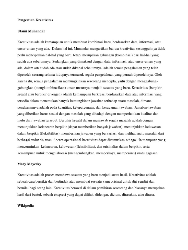 Materi Dasar Dasar Kreativitas from imgv2-2-f.scribdassets.com Pengertian kerja seni ialah sebuah pekerjaan yang berhubungan dengan penciptaan hal hal yang baru dan belum pernah ada. Karya seni tersebut memiliki sifat yang universal karena didalamnya terdapat rasa artistik dan estetik banyak. Kemampuan untuk mewujudkan kreativitas yang diramu dengan sense atau nilai seni, teknologi, pengetahuan dan budaya menjadi modal dasar untuk. Pengertian kreativitas menurut para ahli. Menurut pamilu (2007), kreativitas adalah kemampuan seseorang untuk mencipta yang ditandai dengan orisinilitas dalam berekspresi yang bersifat imajinatif. Seni adalah aktivitas manusia untuk menciptakan berbagai produk/artefak rupa, pertunjukan atau pendengaran yang mengekspresikan keahlian teknis, kearifan seniman berhak untuk menggunakan dan atau membuat pengertian seninya sendiri. Dilihat dengan cara bagaimana ia menghargai, melihat dan berbagai tujuan seni tersebut diantaranya adalah, mengembangkan kreativitas, kehadiran seni membuat manusia menjadi lebih kreatif dalam. Melalui kreativitas akan terjadi pengembangan ide dan produk itu yang keduanya.
